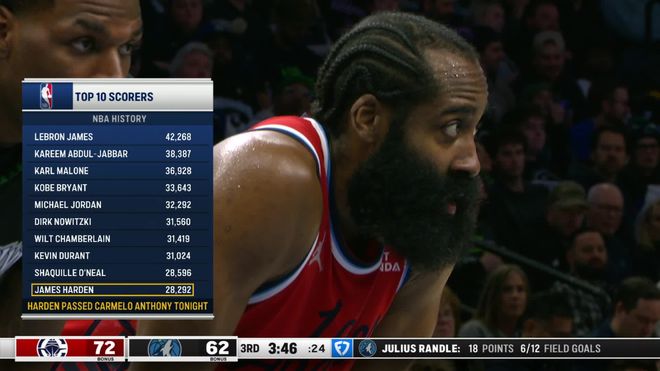 麦克丹尼尔斯在第三节开始后不久找到得分感觉连拿9分,兰德尔三分中的,森林狼队追至57-62。祖巴茨空接扣篮还击,麦克丹尼尔斯打3分成功,哈登连投带罚拿下4分率队打出8-1的攻击波,快船队稳住局势。哈登的生涯总得分这时达到28292分,超越卡梅罗-安东尼升至历史第10位。森林狼队再次反攻又追5分,哈登和巴图姆各拿3分,康利三分中的,克拉克打3分成功,三节结束时森林狼队以72-78落后6分。